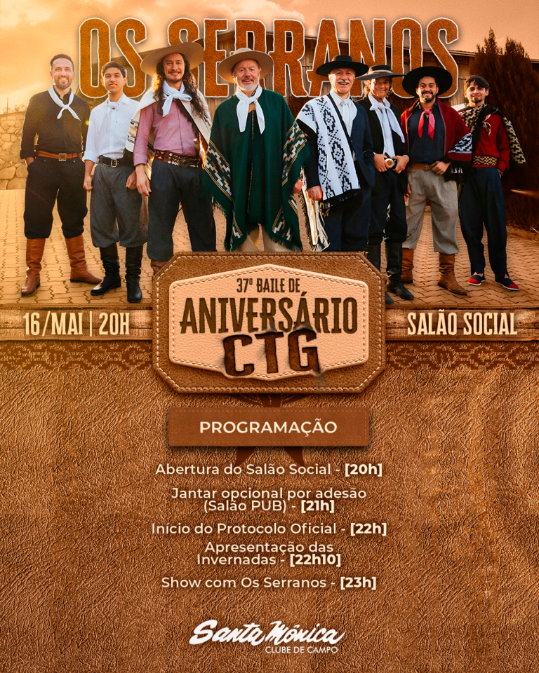 O Baile de Aniversário do CTG – Querência Santa Mônica é para associados e convidados que valorizam a cultura gaúcha e a boa música. E este ano, com show de @OsSerranos pra fazer o salão vibrar! -Programação20h – Abertura do…