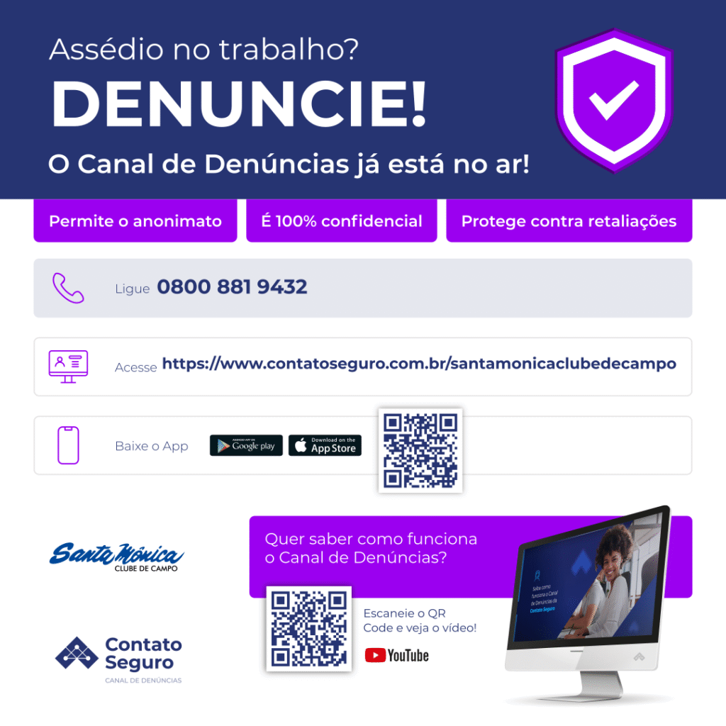 O Canal de Denúncias do Santa Mônica Clube de Campo já está no ar, pronto para receber informações sobre qualquer má conduta no ambiente de trabalho, como assédio, suborno, discriminação e outros comportamentos irregulares.