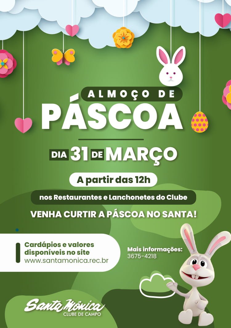 No dia 31 de março, domingo de Páscoa, o Restaurante do Lago (CTB), o Buffet Flemming e o Quintal da Bocha terão menus especiais para os Moniquenses que quiserem celebrar a data no Clube.