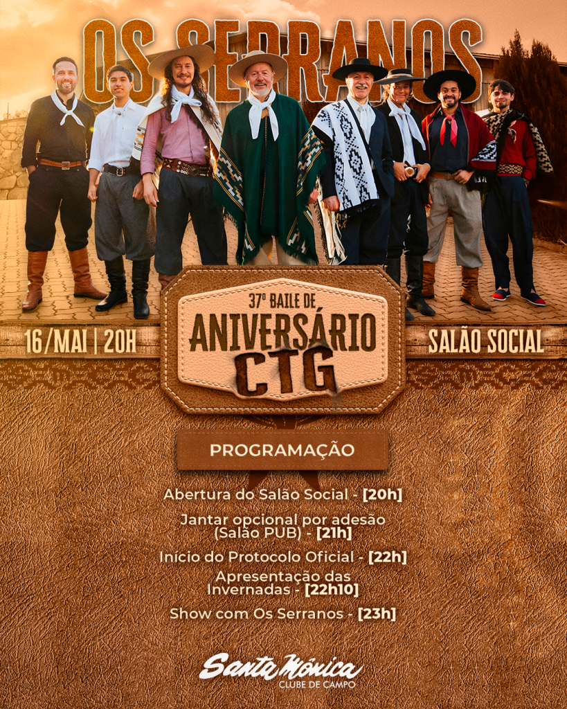 O CTG Querência Santa Mônica celebra seu aniversário no dia 16 de maio de 2026 com uma programação especial que inclui protocolo oficial, apresentações das invernadas e show da banda Os Serranos. O evento será realizado no Salão Social e é destinado aos associados e seus convidados.