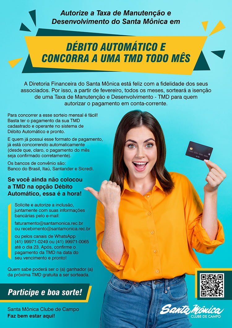 Solicite e autorize a inclusão, até o dia 23, juntamente com suas informações bancárias, pelo e-mail: faturamento@santamonica.rec.br ou recebimento@santamonica.rec.br. Se preferir, utilize os nossos canais pelo WhatsApp: (41) 99971-0249 ou (41) 99971-0065. Após, confirme o pagamento da TMD na data do seu vencimento e pronto, já estará concorrendo.
