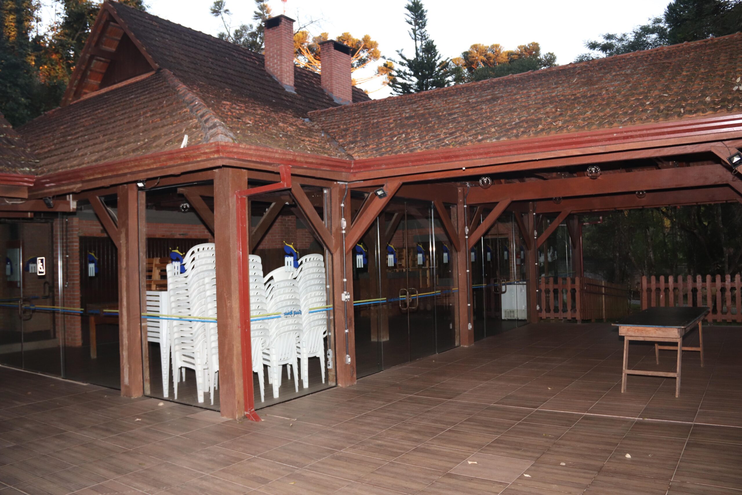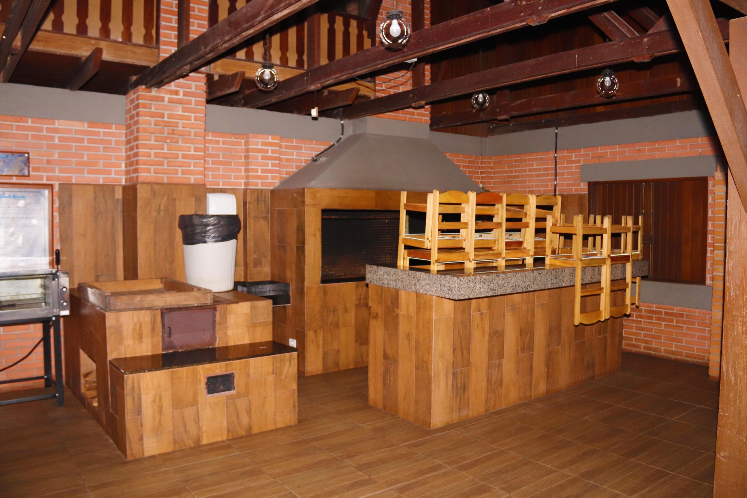 Espaço em estilo rústico, indicado para aniversários, festas infantis, confraternizações e churrascos. Permite a instalação de brinquedos na área externa.