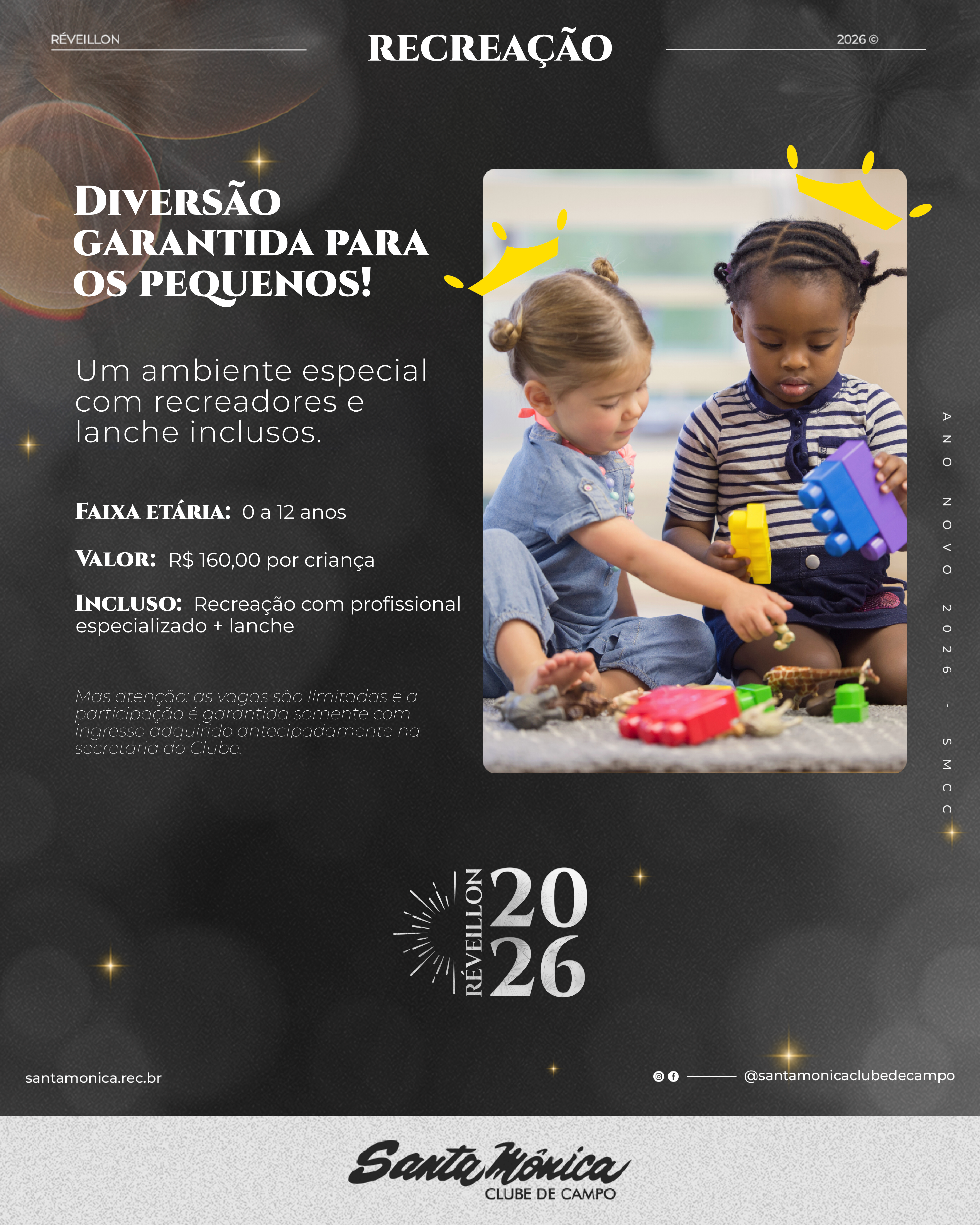 Pensando no conforto das famílias que estarão presentes em nosso Réveillon, o Santa Monica Clube de Campo preparou um Espaço Kids exclusivo, com recreação, atividades lúdicas e acompanhamento cuidadoso durante todo o período do evento. Além disso, o espaço conta com lanche incluso, oferecendo ainda mais comodidade aos pais.