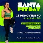 No dia 29 de novembro, das 14h às 18h, acontece o Santa Fit Day, com aulas especiais, torneio esportivo, food trucks e muita diversão para toda a família.