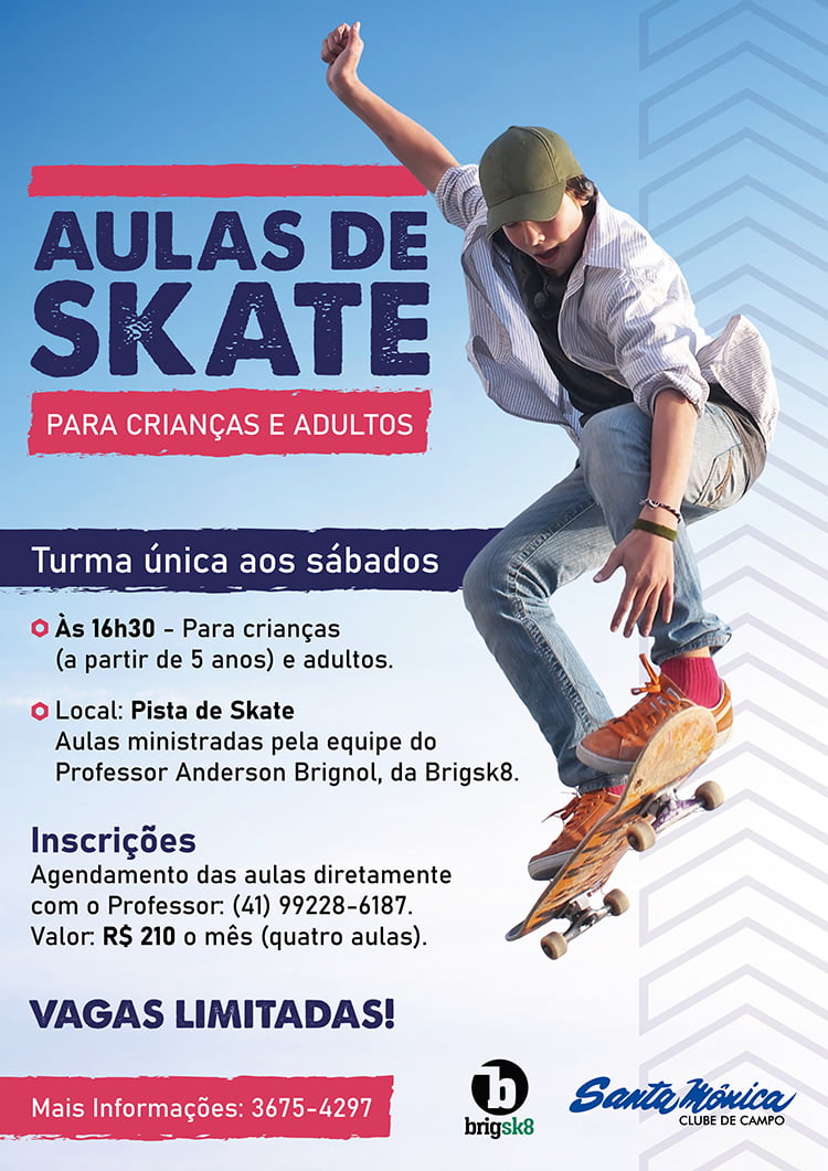 O Santa Mônica Clube de Campo oferece aos seus associados a possibilidade de praticar a modalidade do Skate da forma mais segura possível e com a estrutura de uma das melhores pistas da Região Sul do Brasil.