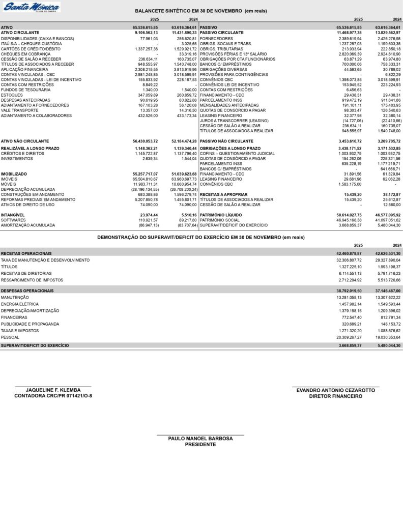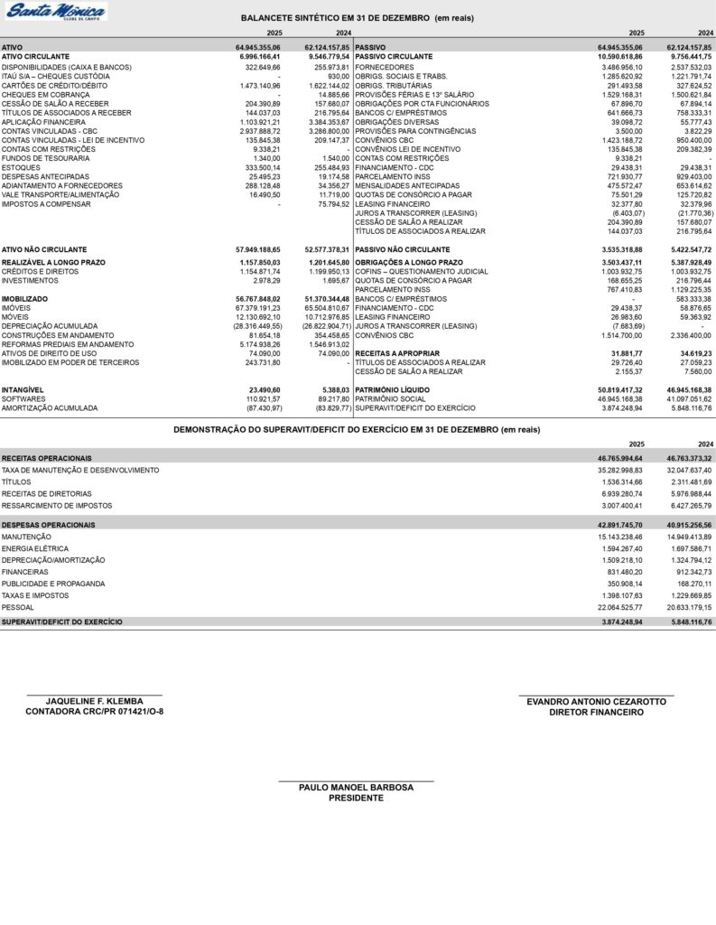 Home Diretrizes Finanças Balanço Patrimonial e Notas Explicativas Balanço Sintético 2022 Parecer da Auditoria 2022 Notas Explicativas Balanço 2022 Relatório de Gestão 2022 Parecer da Auditoria 2023 Notas Explicativas Balanço 2023 Relatório de Gestão Financeira e Orçamentária 2023 Balanço Sintético 2023 Relatório De Gestão 2023 Parecer Da Auditoria 2024 Notas Explicativas Balanço 2024 Relatório de Gestão Financeira e Orçamentária_2024 Balanço Sintético 2024 Certidões Certidão Trabalhista 01.08.2026 Certidão FGTS 24.02.2026 Certidão Federal 01.08.2026 Certidão Estadual 02.06.2026 Certidão Municipal 05.05.2026 Atas de Prestação de Contas Ata De Aprovacao De Contas 2021 Ata De Aprovacao De Contas 2022 ATA PRESTACAO DE CONTAS 2023 Ata Da Assembleia Geral Ordinária 27.03.25 Parecer do Conselho Fiscal Parecer do Conselho Fiscal – Balanço 2022 Parecer do Conselho Fiscal – Balanço 2023 Parecer Do Conselho Fiscal Balanço 2024 Parecer do Conselho Deliberativo Parecer do Conselho Deliberativo – Balanço 2023 Parecer do Conselho Deliberativo – Balanço 2022 Parecer Do Conselho Deliberativo Balanço 2024