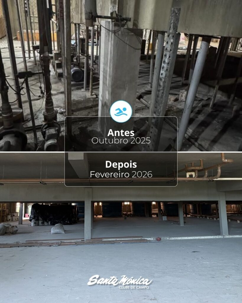 As obras de restauro das piscinas cobertas do Santa Mônica Clube de Campo, que contemplam a piscina semiolímpica e a infantil, avançam para a fase final de execução. Os trabalhos já estão em etapa de acabamento e, conforme o cronograma previsto, têm conclusão estimada para meados de março de 2026.