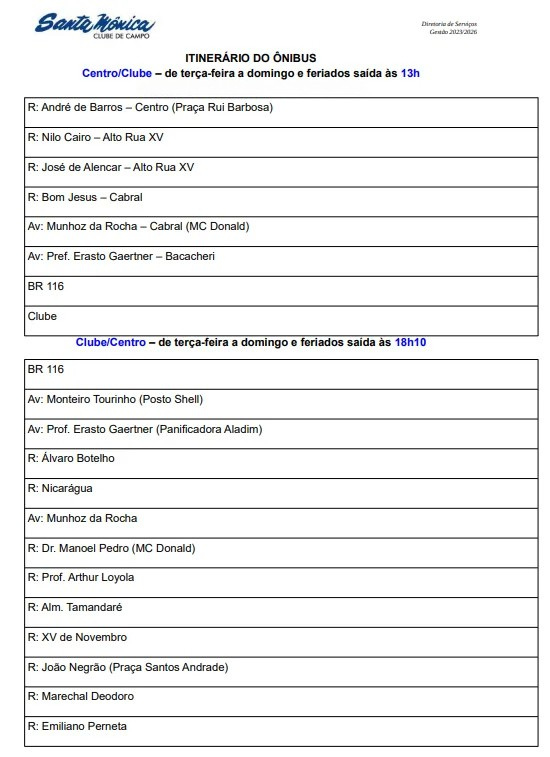 O Santa Mônica possui linhas de ônibus regulares, exclusivo para associados. Valor: R$ 6,50