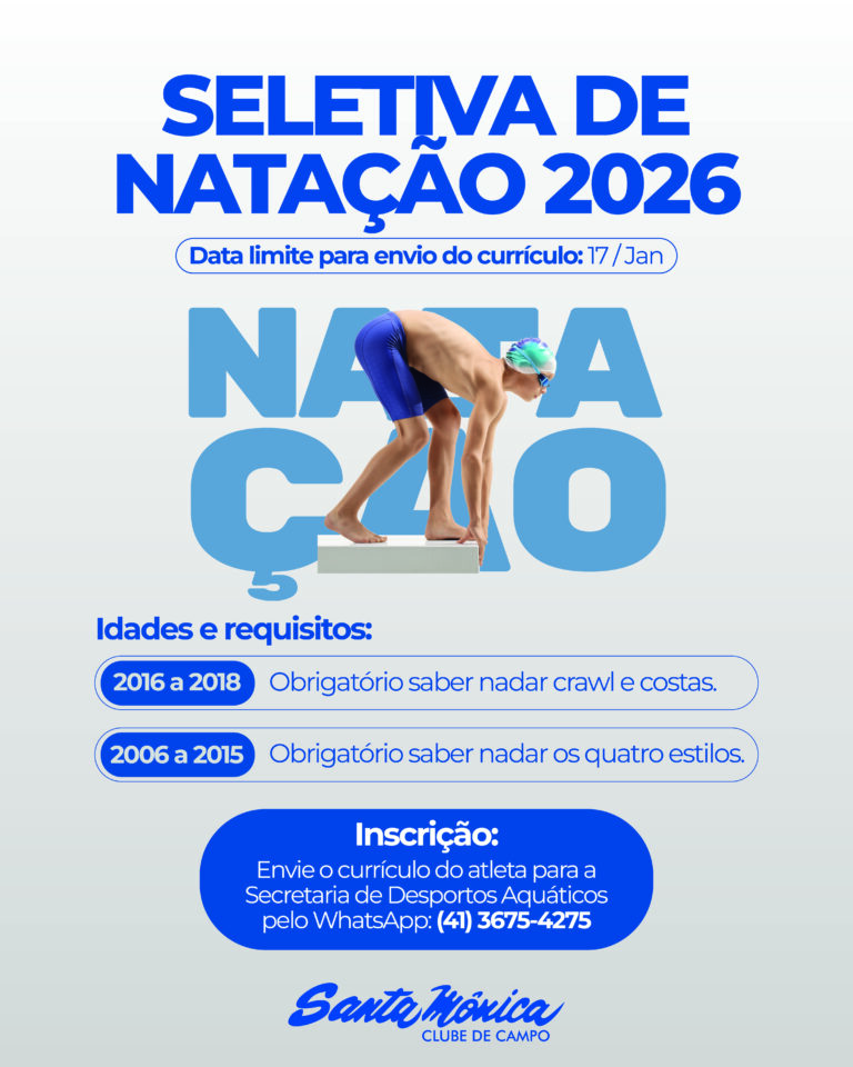 O esporte garante mais saúde e qualidade de vida para todos. O Santa Mônica Clube de Campo disponibiliza o suporte necessário para o seu bem-estar e de sua família, num ambiente seguro e diferenciado, além de excelente infraestrutura. Dispõe de um Complexo Aquático, com piscina olímpica aquecida e coberta, uma das mais modernas do Brasil, além disso, oferece aulas de Natação a partir de 4 anos até a categoria master e raias livres para a prática do esporte. Saiba mais aqui.