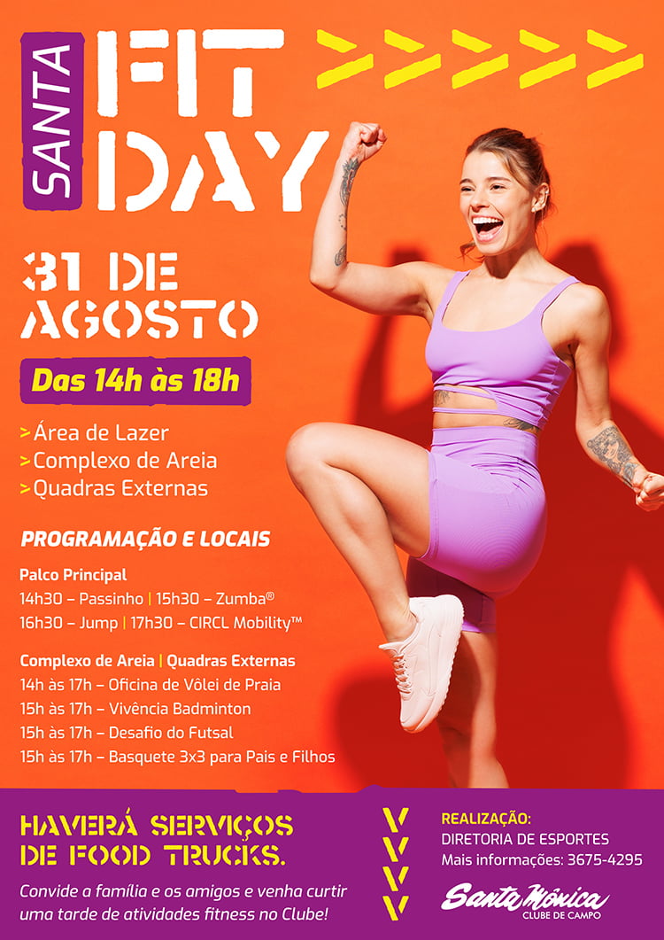 Neste sábado, dia 31 de agosto, a Diretoria de Esportes promoverá mais uma edição do Santa Fit Day, o evento mais fitness do Clube.