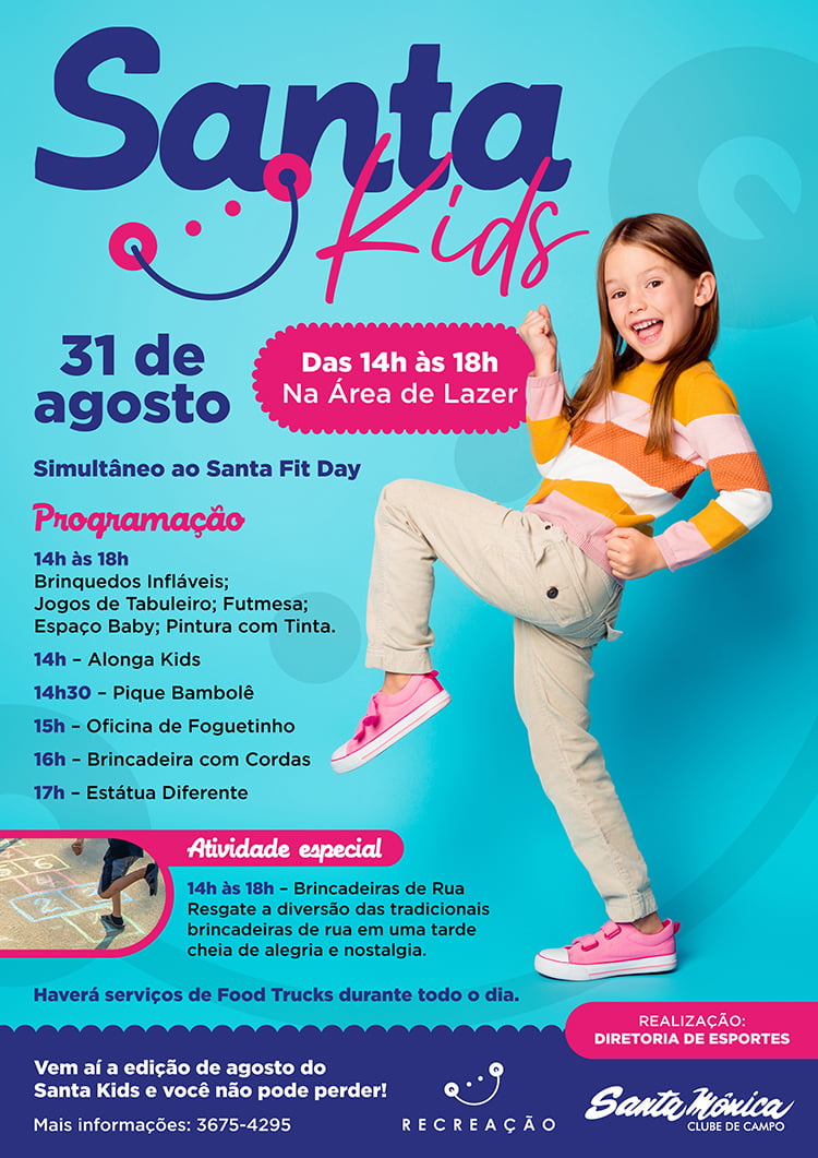Neste sábado, dia 31 de agosto, o Santa Kids está de volta, e a edição deste mês vai movimentar a Área de Lazer, em novo horário, das 14h às 18h, simultâneo ao Santa Fit Day.
