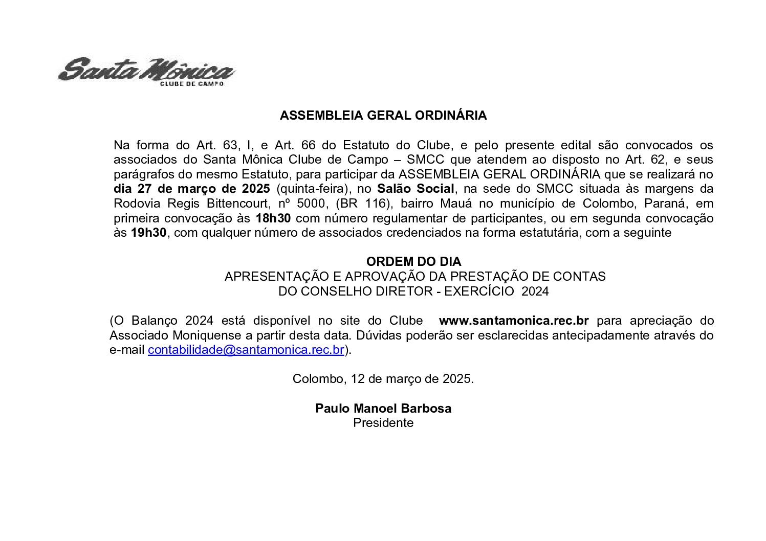 Home Santa Mônica convoca associados para Assembleia de Prestação de Contas Edital Prestação De Contas 12.03