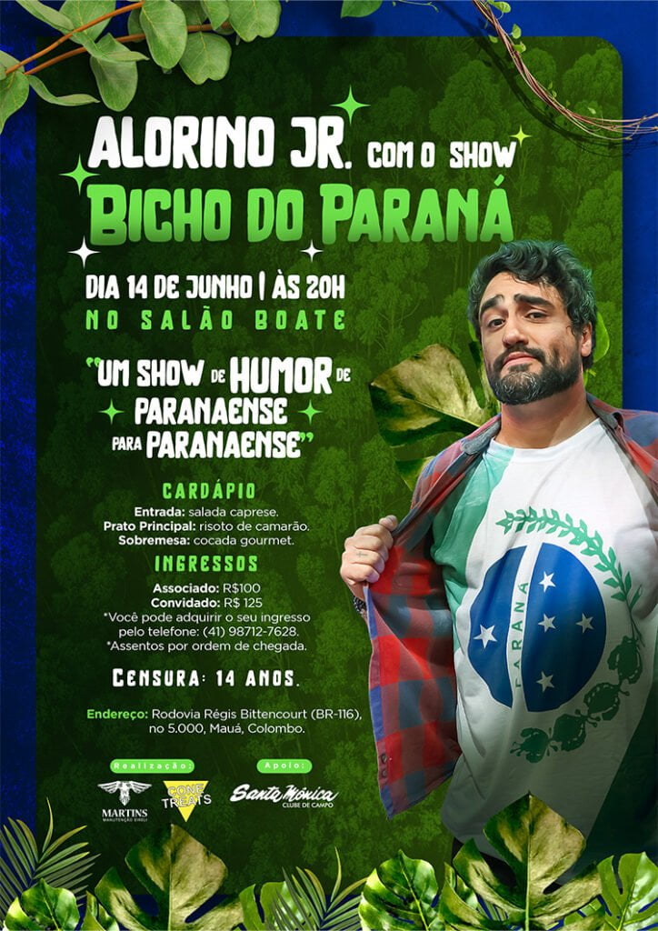 No dia 14 de junho, o Santa Mônica receberá o humorista Alorino Jr., que promete arrancar boas risadas dos Moniquenses com histórias da sua infância, adolescência e dia a dia, tudo em forma de piada, no show “Bicho do Paraná”.