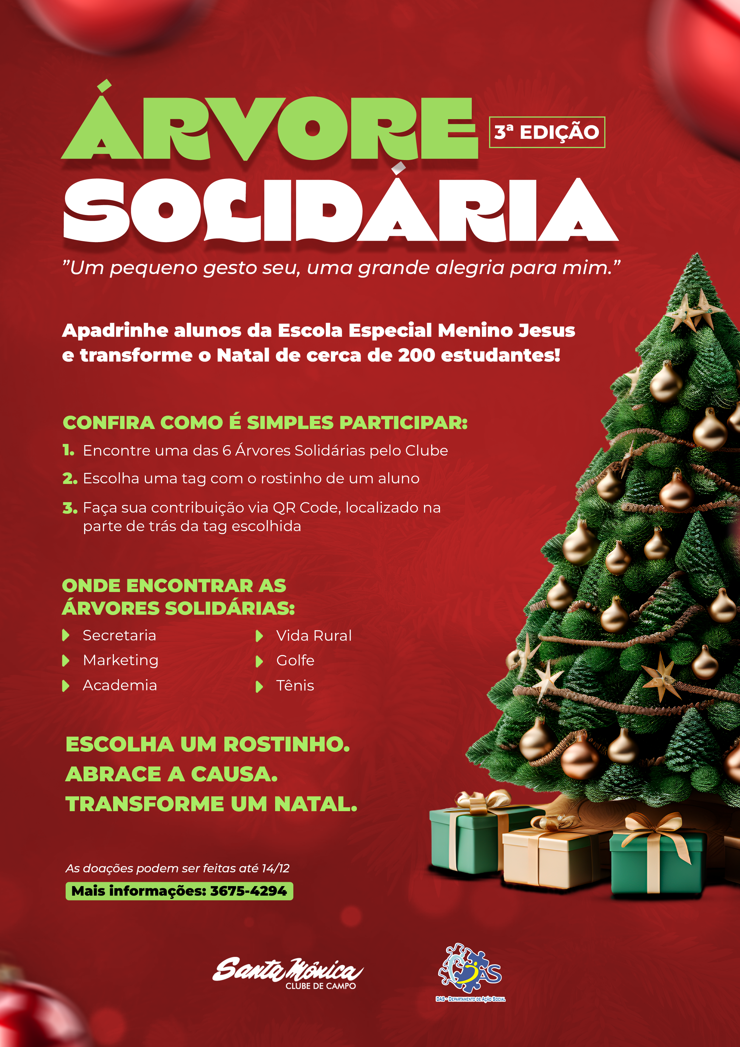 A Árvore Solidária chega à sua 3ª edição, promovida pelo Departamento de Ação Social (DAS), com o objetivo de transformar o Natal de aproximadamente 200 alunos da Escola Especial Menino Jesus.