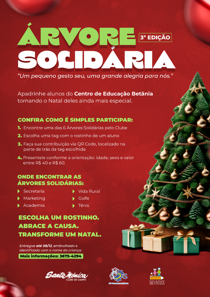 A ação beneficia os estudantes do Centro de Educação Betânia. A iniciativa convida os associados a apadrinhar um aluno por meio das tradicionais bolinhas distribuídas pelas árvores espalhadas pelo Clube, cada uma contendo as orientações do presente.