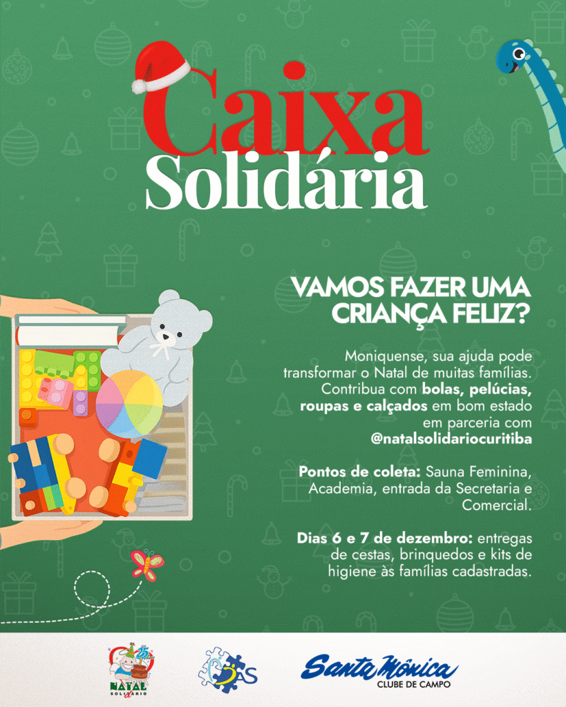 Também promovida pelo DAS, a campanha Caixa Solidária amplia o alcance da solidariedade ao arrecadar itens para diversas famílias atendidas em parceria com o Natal Solidário Curitiba. São recebidas bolas, pelúcias, roupas e calçados em bom estado, que podem ser entregues nas caixas instaladas na Sauna Feminina, Academia, Secretaria e Comercial.